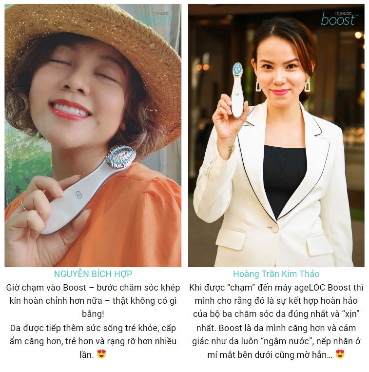 “Thiết bị ageLOC Boost được trang bị công nghệ dòng điện tiên tiến đang chờ cấp bằng sáng chế từ Nu Skin, được chứng minh lâm sàng giúp đem lại hiệu quả rõ rệt. Kết hợp với tinh chất ageLOC Boost Activating Treatment vừa có tác dụng dẫn truyền dòng điện, vừa đóng vai trò là nguồn cung cấp dưỡng chất giúp nuôi dưỡng làn da khỏe mạnh và phục hồi các dấu hiệu lão hóa.”