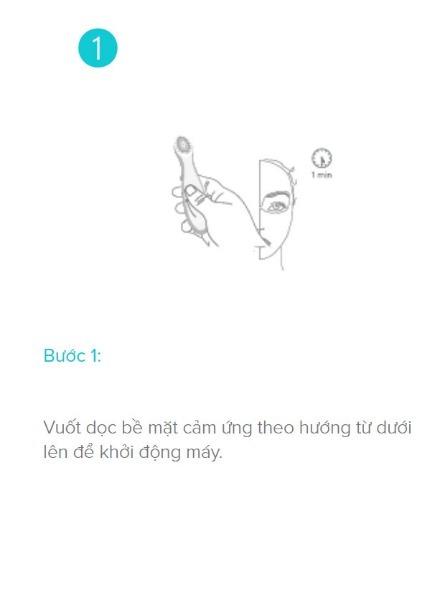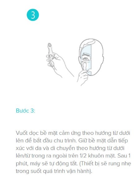 Ấn khởi động máy và bắt đầu chăm sóc da trong 1 phút theo hướng từ trong ra ngoài, từ dưới lên trên.