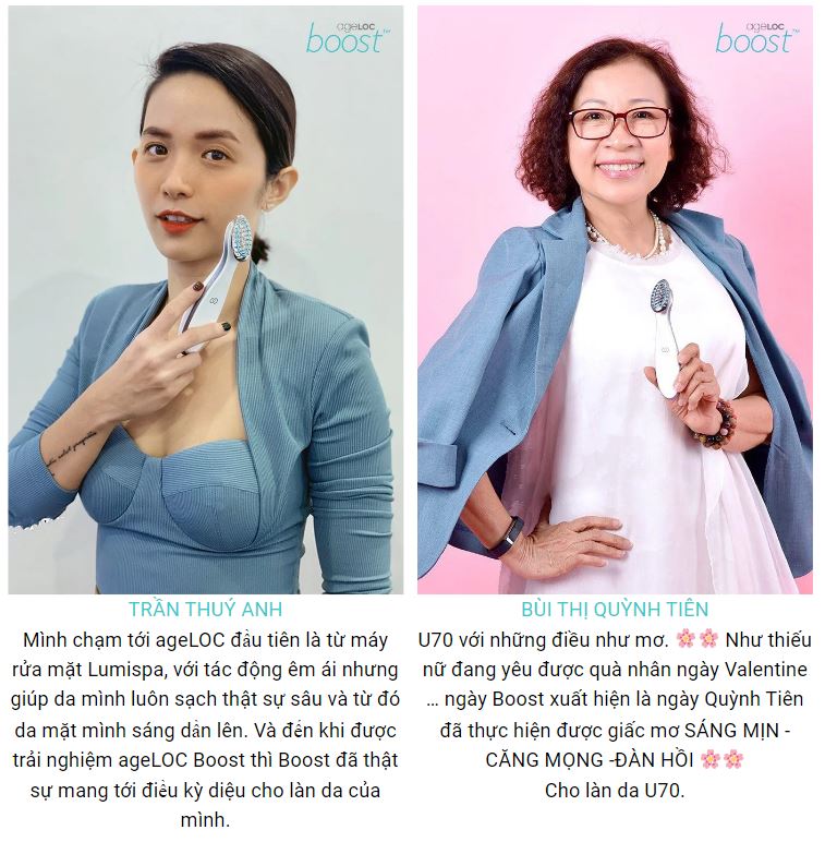 “Thiết bị ageLOC Boost được trang bị công nghệ dòng điện tiên tiến đang chờ cấp bằng sáng chế từ Nu Skin, được chứng minh lâm sàng giúp đem lại hiệu quả rõ rệt. Kết hợp với tinh chất ageLOC Boost Activating Treatment vừa có tác dụng dẫn truyền dòng điện, vừa đóng vai trò là nguồn cung cấp dưỡng chất giúp nuôi dưỡng làn da khỏe mạnh và phục hồi các dấu hiệu lão hóa.”