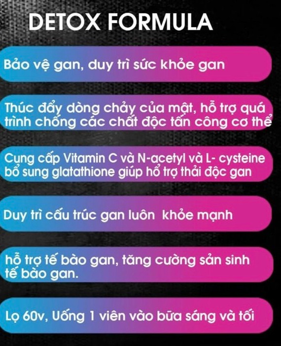 - Sản phẩm kết hợp các thành phần chống oxy hóa, bảo vệ và tăng cường chức năng gan, đảm bảo quá trình thải độc hiệu quả mà vẫn an toàn cho cơ thể.