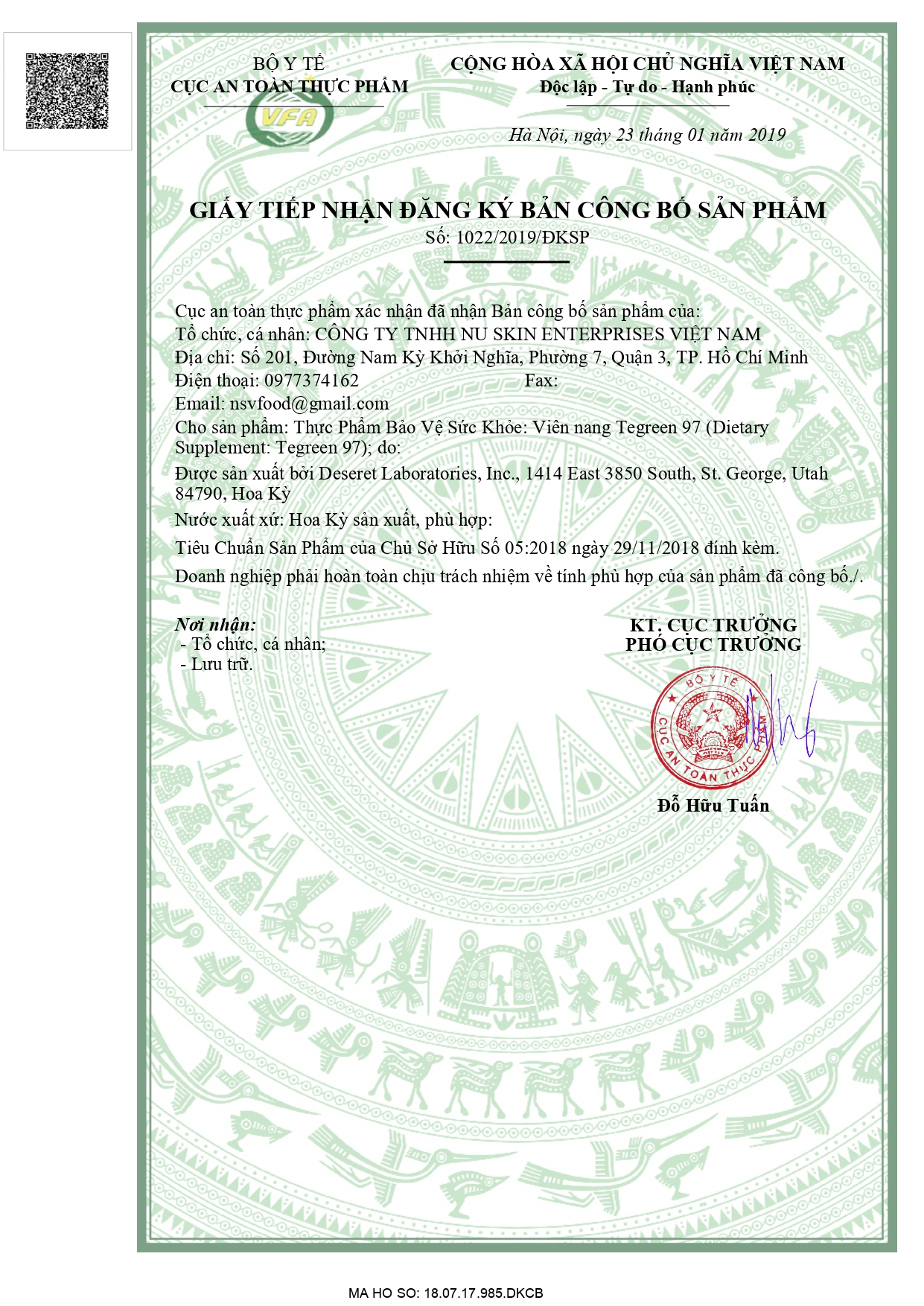 Số tiếp nhận đăng ký công bố:1022/2019/ĐKSP